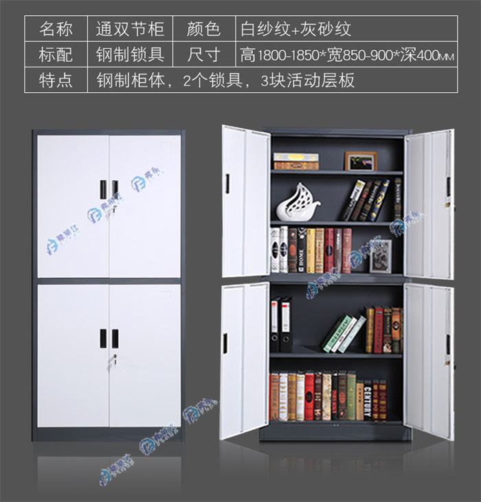 顏色:白紗紋+灰紗紋 規(guī)格:高1800-1850*寬850-900*深400mm 用途:鋼制柜體,2個鎖具,3塊活動層板,廣泛適用于各種場所。